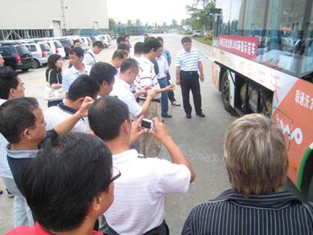 論壇結(jié)束后,與會代表及記者們紛紛走出酒店大堂,來到車輛示范現(xiàn)場觀摩,賽侖吉地大酒店停車場上頓時一片熱鬧非凡。當(dāng)來到深圳“五洲龍”牌LNG環(huán)保示范車前時,長沙市清潔汽車協(xié)調(diào)領(lǐng)導(dǎo)小組專家組組長李竹林教授一行,對深圳“五洲龍”牌LNG環(huán)保示范車產(chǎn)生了濃厚的興趣,饒有興致地和與會代表們一同登車體驗。當(dāng)相關(guān)負責(zé)人介紹到五洲龍公司配置的“AST”(自動溫控散熱節(jié)能系統(tǒng))以及燃氣泄漏報警系統(tǒng)時,國內(nèi)外代表們均給予了很高評價。李教授稱此兩項系統(tǒng)已被納入了建設(shè)部國家標(biāo)準(zhǔn)“公共汽車分等級技術(shù)要求與配置”,居國內(nèi)節(jié)能與燃氣運行安全的領(lǐng)先地位。體驗運行示范車后,車輛的性能,發(fā)動機運轉(zhuǎn)噪音、工況,車內(nèi)密封性等情況也獲得了代表們的一致好評。同時,代表們對車輛的不足之處提出了寶貴的意見和建議,為“五洲龍”牌LNG環(huán)??蛙囋谫|(zhì)量服務(wù)方面精益求精、日臻完善,提供了重要借鑒。
