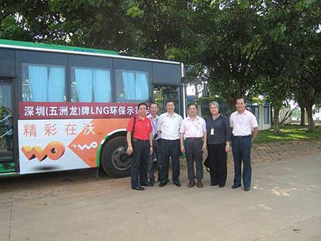 與會重要代表在深圳“五洲龍”牌LNG環(huán)保示范車前合影留念