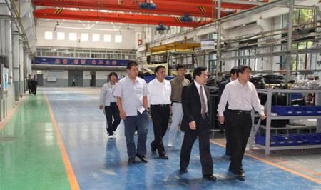 在歐V客車總經理樊文堂、黨委副書記梁治紅等人的陪同下,王世敦副主席和孫建設總裁先后參觀了北京市新能源汽車產業(yè)設計生產基地,重點參觀基地中的歐V客車總裝車間及國家級節(jié)能減排重點實驗室,期間樊總親自介紹了現(xiàn)生產線上的北京公交混合動力、以及交付的濟南公交混合動力的情況,在沿途參觀中梁書記介紹了近段時間的總體生產情況。