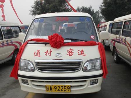 近年來,陜西省按照城鄉(xiāng)一體化和“路通車通”的發(fā)展思路,大力發(fā)展通村客運(yùn),并從2009年開始,在全省陸續(xù)投放1萬輛輕型或中型客車作為覆蓋陜西全部農(nóng)村的“村村通工程”用車,每輛車政府補(bǔ)貼2萬元。此次投入運(yùn)營(yíng)的40輛大金龍A+海獅,是陜西“萬輛通村工程”的首批投放車輛,主要投放在西安市周至縣的5條通村客運(yùn)線路。至此,周至縣也成為陜西省第一個(gè)實(shí)現(xiàn)村與村通公交的縣。