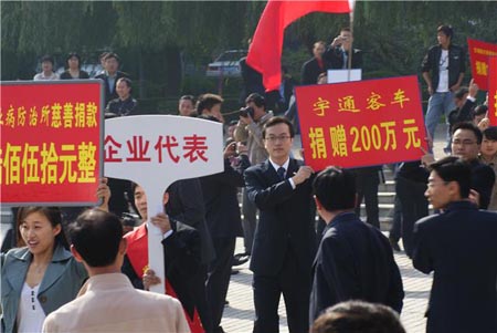 10月16日,2009鄭州慈善日活動(dòng)在綠城廣場(chǎng)舉行,繼去年捐款100萬(wàn)元后,宇通客車慷慨解囊,再次捐出200萬(wàn)元,成為當(dāng)天捐款金額最多的企業(yè),用實(shí)際行動(dòng)擔(dān)負(fù)企業(yè)公民的社會(huì)責(zé)任,推動(dòng)和諧社會(huì)建設(shè)。