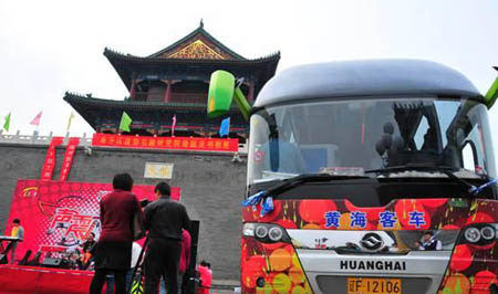 在巡演活動(dòng)中,黃??蛙囈宦犯S“聲震八方”節(jié)目組先后在天津、北京、濟(jì)南、南京、杭州等這些大城市進(jìn)行慢速巡游、新聞發(fā)布會(huì)、路演、海選和幕后故事拍攝等多項(xiàng)活動(dòng),并在群眾密集的地區(qū)與城市居民進(jìn)行互動(dòng)表演,可以說(shuō),在整個(gè)活動(dòng)中,黃??蛙嚰仁茄輪T的運(yùn)輸工具,也是表演舞臺(tái)的背景,更是“聲震八方”節(jié)目的錄制道具。在這3個(gè)月的時(shí)間里,天津的銀河廣場(chǎng)、北京的世貿(mào)天階、濟(jì)南的淮陰華聯(lián)超市廣場(chǎng)、南京的中山陵園以及杭州西湖等等十多個(gè)城市的幾十處知名地點(diǎn)都留下了黃海大巴矯健的身影。