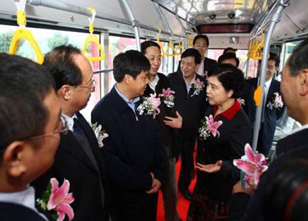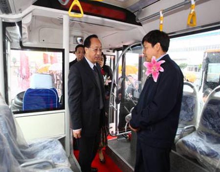 重慶市副市長童小平(右二)在恒通氣/電混合動力客車上向領(lǐng)導、來賓介紹重慶新能源汽車情況