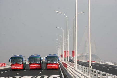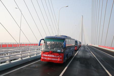 9:30分,隨著典禮上齊鳴的禮炮、升空的禮花和氣球,歡樂的人群開始涌動,上海長江隧橋通車儀仗車隊在彩車的引領(lǐng)下浩浩蕩蕩通過長江第一橋。海格客車在觀眾和中央、上海眾多媒體的注目下,勝利地完成了這次跨越。