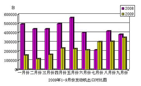 2009年9月份,發(fā)動機產(chǎn)品出口34.84萬臺,比去年同期下降了8.91%;出口金額0.84億美元,比去年同期下降了19.31%。