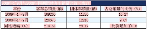 2. 2009年1~9月,團(tuán)體客車占據(jù)客車總銷量的比例為10.27%,比2008年同期要多近0.6個(gè)百分點(diǎn),說明團(tuán)體客車的市場(chǎng)份額不但沒有隨著銷量的減少而減少,反而在逐步增大。