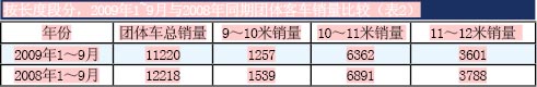 從表1和表2可以看出,2009年1~9月,團(tuán)體客車銷售呈現(xiàn)以下特點(diǎn):