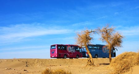路途漫漫,黃沙萬里,登上大金龍客車,我們繼續(xù)前行,車輪卷起路面的飛沙,將我們的思緒揚(yáng)撒在這片神奇的土地上。