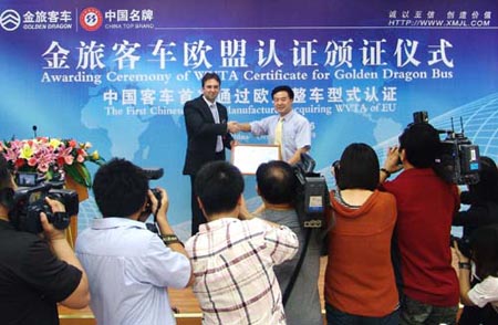 近日,金旅XML6937旅游客車,XML6121城際交通車先后通過歐盟整車型式認(rèn)證,獲得WVTA證書,廈門金旅因此成為中國首家獲得歐盟整車型式認(rèn)證證書的客車企業(yè)。2009年10月26日,金旅客車榮獲歐盟整車型式認(rèn)證證書的頒證儀式在廈門金旅公司隆重舉行,TüV德國萊茵中國集團(tuán)南中國區(qū)交通服務(wù)部總經(jīng)理Oliver Rothert特地到場祝賀,金旅公司葉宏廷總經(jīng)理等主要領(lǐng)導(dǎo)出席了頒證儀式。