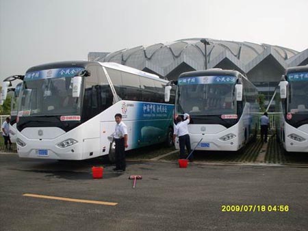 在服務(wù)現(xiàn)場(chǎng),全體服務(wù)人員表現(xiàn)出了高度的責(zé)任感,不僅對(duì)停車場(chǎng)內(nèi)簡(jiǎn)易的板房沒有怨言,對(duì)公司制定的服務(wù)目標(biāo)和近似苛刻的制度沒有抱怨,以主人翁的姿態(tài)認(rèn)真地完成各項(xiàng)保障任務(wù)。每天即使再晚,服務(wù)人員都會(huì)對(duì)每一輛車逐項(xiàng)檢查并一一落實(shí),以保證第二天車輛執(zhí)行任務(wù)。從七月到現(xiàn)在中通客車服務(wù)團(tuán)隊(duì)保證了所有車輛正常運(yùn)行,做到了無拋錨,無故障上路。