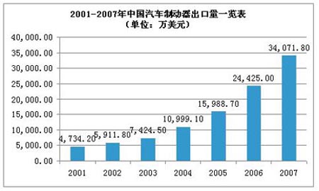 隨著制動(dòng)器及ABS在華量產(chǎn)體制的不斷鞏固,相關(guān)產(chǎn)品開始向海外出口。來自中國海關(guān)總署的數(shù)據(jù)顯示,2007年制動(dòng)器出口額增至3.4億美元,相當(dāng)于2001年出口額的7倍。2007年,ABS出口額比2003年增長了49.5%,增至946萬美元。