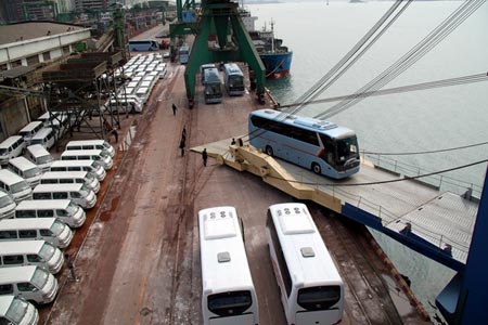 3月25日,經(jīng)廈門海關(guān)驗(yàn)放,40輛大金龍豪華旅游客車在廈門東渡碼頭整齊列隊(duì),陸續(xù)駛上滾裝船,即將駛往北非某國。據(jù)了解,這是大金龍與當(dāng)?shù)乜蛻粲诮衲?月簽訂的100輛客車訂單中的最后40輛,早在3月20日,該批訂單中的60輛公交車已經(jīng)在上海裝船,發(fā)往非洲。這也是自2005年以來,大金龍連續(xù)第6年向該國出口客車。目前大金龍累計(jì)出口到該國的客車已經(jīng)超過900輛,在中國客車企業(yè)中名列前茅。當(dāng)日,與這40輛旅游客車同時(shí)裝船的還有大金龍出口埃及的180輛輕型客車。