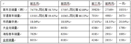 1月份達(dá)到最高的20.04%,2、3月份有所小降,4、5月份又持續(xù)攀升,宇通的市場(chǎng)占有率曲線(xiàn)呈現(xiàn)出明顯的V形。