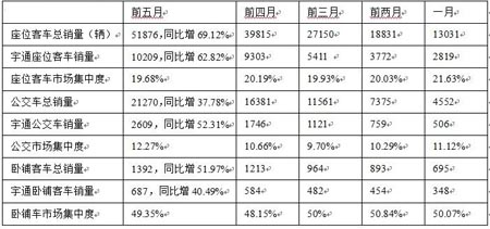 首先是大中型客車(chē)市場(chǎng)占有率持續(xù)提升。前五月,宇通客車(chē)銷(xiāo)量增長(zhǎng)59.41%,略高于客車(chē)市場(chǎng)整體增幅,但7米以上大中型客車(chē)共計(jì)銷(xiāo)售12094輛(僅比“三龍”銷(xiāo)量之和少1964輛),增速為67.62%,比市場(chǎng)平均增幅高出13個(gè)百分點(diǎn)。同時(shí),其在大中型客車(chē)的份額也一直在增長(zhǎng),從前三月的23.12%,到前四月23.37%,再到前五月的24.05%,份額增長(zhǎng)相對(duì)較快。