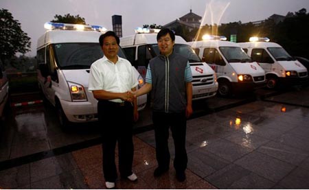 江鈴緊急趕制的5輛福特全順救護(hù)車一到達(dá)災(zāi)區(qū),立即被派往受災(zāi)前線救護(hù)受災(zāi)民眾。
