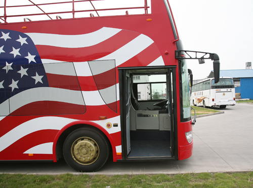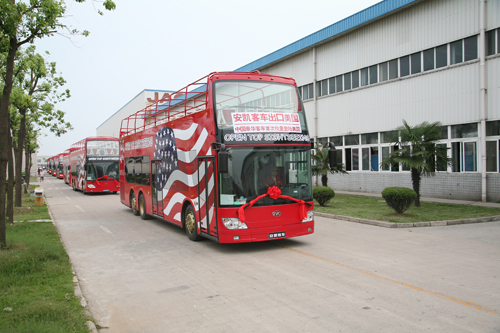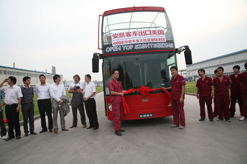 2010年7月1日,11輛身披美國國旗圖案的雙層敞篷車緩緩駛出了安凱客車廠區(qū),它們將從上海港口出發(fā),奔赴它們的目的地——美國洛杉磯南部的國際港口城市長灘。據(jù)了解,這批車單車價值已經(jīng)超過200萬人民幣,因而這也成為我國首次批量出口美國的豪華客車而備受矚目。