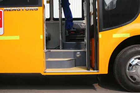 踏步,作為小學(xué)生乘坐校車的第一道安全關(guān)口,貼心設(shè)計大有學(xué)問。新標(biāo)準(zhǔn)規(guī)定,第一級踏步離地高不大于350mm,其他各級踏步的高度應(yīng)不大于250mm,有效深度不小于200mm。校車第一級踏步離地高度低于300mm,其它各級踏步高度僅為150mm,比新標(biāo)準(zhǔn)低了50-100mm,且踏步僅為兩級,各級踏板具有防滑功能,踏板前緣清晰可辨,充分照顧到小學(xué)生的身體特點,讓小學(xué)生上下車更加方便安全。