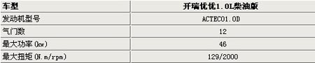 開瑞優(yōu)優(yōu)柴油版搭載ACTECO1.0D發(fā)動機(jī),目前是國內(nèi)排量最小的自主柴油發(fā)動機(jī),擁有12氣門,采用頂置雙凸輪軸、高 壓 共 軌、增壓中冷技術(shù)最大功率可達(dá)46千瓦,并且在2000轉(zhuǎn)的時候即可擁有 129牛米 的最大扭矩,完全可以滿足消費(fèi)者對強(qiáng)勁動力的需求。另外,開瑞優(yōu)優(yōu)1.0L柴油版在油耗方面非常出色,比普通汽油車平均低20%-30%左右。