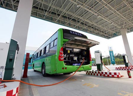 8月28日,由江西省自主研發(fā)的首輛純電動大巴充好電后駛出充電站。
