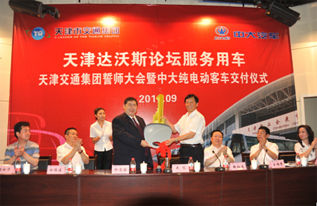 隨后,雙方進行了車輛交接儀式。天津交通集團董事長武岱從中大集團董事長徐連國手中接過象征50輛中大純電動客車的金色鑰匙,表示這批純電動客車正式成為天津交通集團助陣天津夏季達沃斯論壇“綠色交通”的服務(wù)用車。