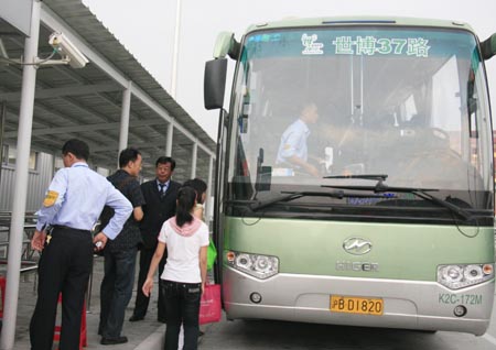 乘客登上37路世博專線海格客車
