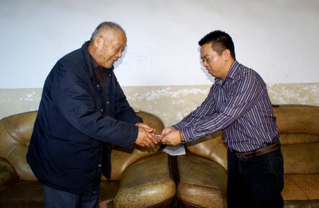 東風(fēng)旅行車公司的代表將慰問(wèn)金送到李豪的父親手中