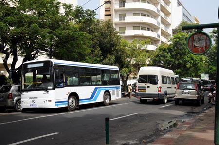在塞恩巴士公司組裝生產(chǎn)的金龍公交客車行駛在達喀爾的街道上