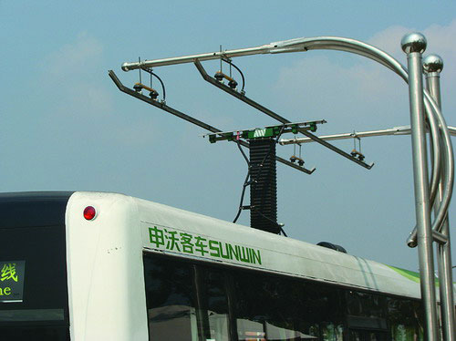 上海世博園區(qū)運行的每輛超級電容公交車上,都安裝著一個特殊的監(jiān)視器,用來監(jiān)測充電情況。據(jù)記者觀察,超級電容公交車每到一站,就會從車頂伸出一個接頭,接到充電架上充電。
