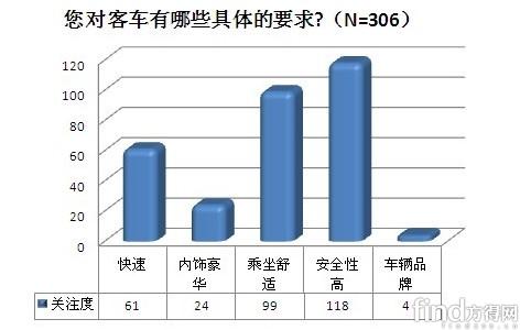 在隨機(jī)抽取的北京市4個(gè)長(zhǎng)途汽車(chē)站中,方得網(wǎng)共發(fā)放了近200份調(diào)查問(wèn)卷,在就“您對(duì)您乘坐的客車(chē)有沒(méi)有要求”發(fā)表看法的146人中,有63%(92人)表示對(duì)乘坐的客車(chē)有具體的要求。