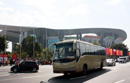 廣東奧體中心外疾駛而過(guò)的金龍客車