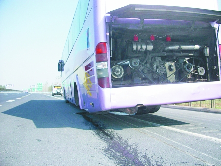 昨日,一輛正在行駛的客車左后輪突然脫離車身(如圖),司機(jī)報(bào)警,在鄭州黃河二橋高速交警的幫助下,將乘客轉(zhuǎn)移到另一輛客車上。