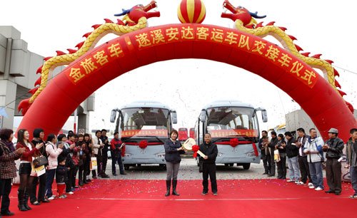 2011年1月4日上午,一排整齊的身披大紅花的金旅XML6807中型豪華客車有序地排列在金旅海滄大客生產(chǎn)廠區(qū)內(nèi),廠區(qū)外則是一派鑼鼓升天、禮炮齊鳴的熱鬧景象,這是“金旅客車—遂溪安達(dá)客運(yùn)車隊交接車儀式”的現(xiàn)場。遂溪安達(dá)客運(yùn)車隊(以下簡稱“遂溪安達(dá)客運(yùn)”)王廣如總經(jīng)理、王廷芳副總經(jīng)理以及廈門金旅銷售公司曹穎副總經(jīng)理等領(lǐng)導(dǎo)和嘉賓出席了此次交接車儀式。