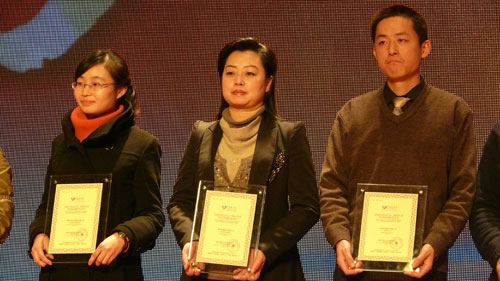 恒通客車(chē)高層領(lǐng)導(dǎo)雷燕(中)代表公司領(lǐng)取客車(chē)行業(yè)2010年度新聞大獎(jiǎng)