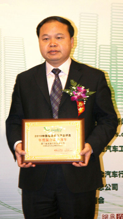 廈門金旅總經(jīng)理助理、技術(shù)中心主任賴志藝接受中國電動汽車全產(chǎn)業(yè)評選:年度混合動力客車證書