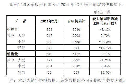 根據宇通客車日前公布的2011年2月份產銷數(shù)據顯示,該公司2月份生產量共計503輛,1-2月同比累計下降8.12%;銷售量共計810輛,1-2月同比累計增長9.77%。