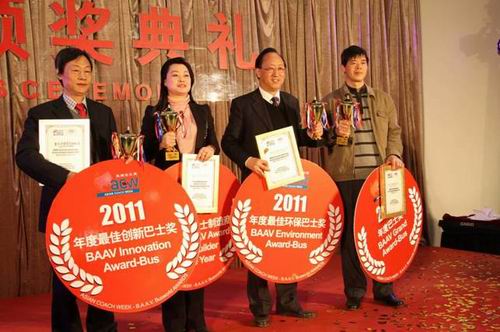 恒通客車執(zhí)行董事鄧平、高層領導及高工代表領取的世界客車聯(lián)盟頒發(fā)的BAAV 2011年度最佳巴士制造商獎及快速充電客車三項大獎