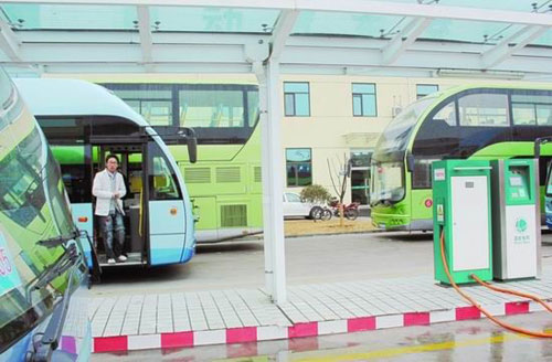 在焦莊電動汽車充電站,公交車在充電
