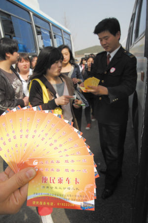 公交三公司二隊的工作人員為學(xué)生們發(fā)放便民乘車卡