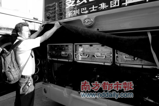 與此前的電動(dòng)的士不同,電動(dòng)中巴不需要充電,而是采取換電池的方式補(bǔ)充動(dòng)力。南都記者掀開車的后蓋看到,幾組大電池像箱子一樣排列在后面,一臺(tái)車一共有9組這樣的電池,每組電池有180公斤,共達(dá)1620公斤。