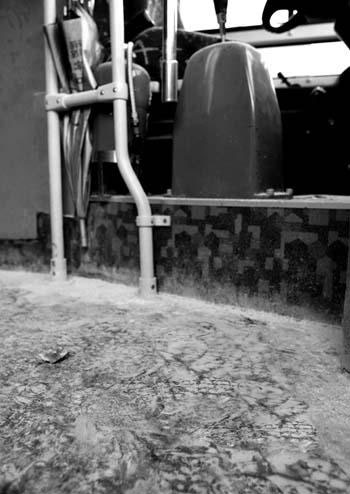11日下午記者在南頭車隊看到雙層混合動力大巴全部停放在車場內(nèi),而故障車輛被停放在門口處檢修。登上車可以聞到,仍有濃重的膠皮燃燒的味道,車頭內(nèi)布滿了一層細細的粉末,這是滅火器使用后留下的。
