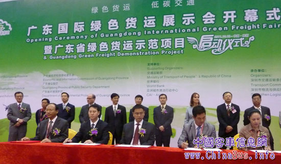 10月12-14日,廣東省綠色示范運(yùn)輸項(xiàng)目展示會在深圳展覽中心舉行。開幕式上,廣東省交通廳綠色運(yùn)輸示范項(xiàng)目辦與蘇州金龍簽訂項(xiàng)目合作意向書,將海格G-BOS系統(tǒng)正式列入該項(xiàng)目。交通運(yùn)輸部道路運(yùn)輸司李剛司長、廣東省交通廳楊細(xì)平副廳長及深圳市政府、世界銀行領(lǐng)導(dǎo)見證簽字儀式。