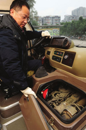 在鄧海的指引下,華西都市報(bào)記者看到,在駕駛室內(nèi),安裝有車內(nèi)、外監(jiān)控系統(tǒng)和行車記錄儀,車內(nèi)外的情況司機(jī)可以一目了然?!盎九渲玫男\囍恍枰?5萬左右,但可以根據(jù)情況加裝許多配置?!编嚭Uf,可以選裝學(xué)童專用信息識(shí)別刷卡機(jī),只要孩子上下車,通過刷卡就可以以短信的方式發(fā)送給父母;駕駛主動(dòng)安全系統(tǒng),駕駛時(shí),可以將監(jiān)控信息投射到前風(fēng)窗,而且車輛在運(yùn)行中系統(tǒng)判斷行駛路線,出現(xiàn)車道偏離的跡象系統(tǒng)會(huì)自動(dòng)進(jìn)行聲光提醒,系統(tǒng)還可以檢測(cè)和前車的距離,小于安全距離時(shí),會(huì)聲光提醒同時(shí)自動(dòng)聯(lián)通后剎車燈,對(duì)候車提醒預(yù)防追尾。