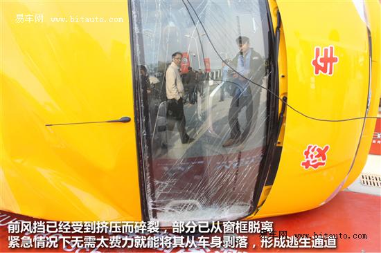 我們通過(guò)對(duì)車(chē)輛底部的肉眼觀察沒(méi)有發(fā)現(xiàn)有油液泄露現(xiàn)象。走到車(chē)前,前風(fēng)擋已經(jīng)碎裂,只需從內(nèi)測(cè)施加一定外力就可以將其從車(chē)身上拆卸下來(lái),在遇到側(cè)翻事故時(shí)可以與后方車(chē)門(mén)一起形成逃生通道。