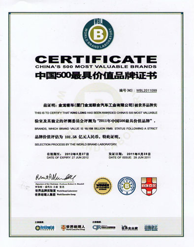 2011年,“金龍客車”以101.58億元的品牌價(jià)值躋身中國品牌前100強(qiáng)