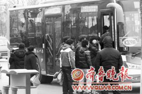 2月9日,在市區(qū)百貨大樓路口,市民依次乘公交車。