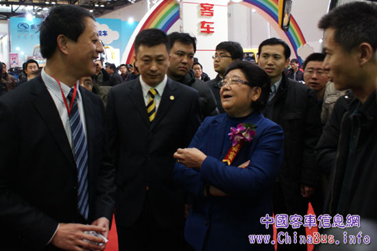 中通客車(chē)總經(jīng)理孫慶民及副總經(jīng)理賈開(kāi)淺為中國(guó)關(guān)心下一代委員會(huì)副委員長(zhǎng)顧秀蓮介紹中通校車(chē)