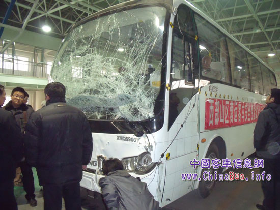 2月22日下午2時(shí),交通部“客車前部結(jié)構(gòu)強(qiáng)度”試驗(yàn)專家組成員和各客車企業(yè)技術(shù)工程師齊聚北京交通部汽車試驗(yàn)場,共同見證了“中國客車正面第一碰”的整個(gè)試驗(yàn)過程。試驗(yàn)車輛為金龍客車XMQ6900Y平頭車型,車長9m,車身質(zhì)量9000KG。據(jù)介紹,此次正面碰撞的試驗(yàn)方法和結(jié)果評(píng)估是參照歐洲ECE R29《關(guān)于商用車駕駛室乘員安全保護(hù)認(rèn)證規(guī)定》進(jìn)行的,車輛通過外部牽引加速,以30km時(shí)速與試驗(yàn)壁障發(fā)生正面撞擊,據(jù)實(shí)驗(yàn)專家組介紹,該速度下車輛撞擊的能量為312.55kJ(千焦),這個(gè)能量級(jí)別相當(dāng)于一輛重約1.5噸的乘用車(中級(jí)轎車)以50km時(shí)速進(jìn)行碰撞產(chǎn)生能量的兩倍,相當(dāng)于ECE R29規(guī)定值55 kJ的6倍。