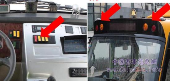 當(dāng)司機(jī)停車前,按下停車燈開關(guān)(左一紅色箭頭指示),黃色預(yù)備停車燈開始閃爍,當(dāng)車輛停止后,黃色燈熄滅,紅色停車燈開啟。
