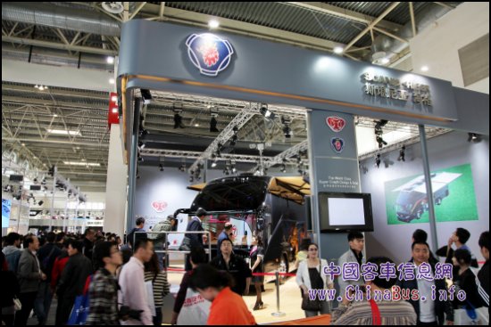 展位上方醒目的SCANIA•HIGER雙品牌LOGO,表明了它的身份。