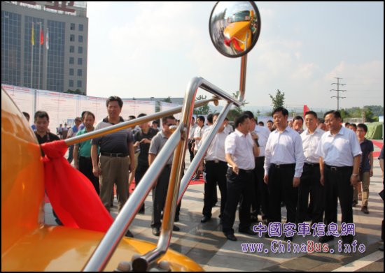 市安監(jiān)局局長(zhǎng)肖健康(右)向國(guó)家安監(jiān)總局局長(zhǎng)楊棟梁(中)、副市長(zhǎng)劉學(xué)普(左)介紹恒通金剛校車